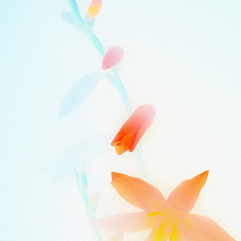 ブルーの色調が霧の柔らかな広がりを引き立て、花の鮮やかな色彩と繊細な輪郭が際立つ作品です。