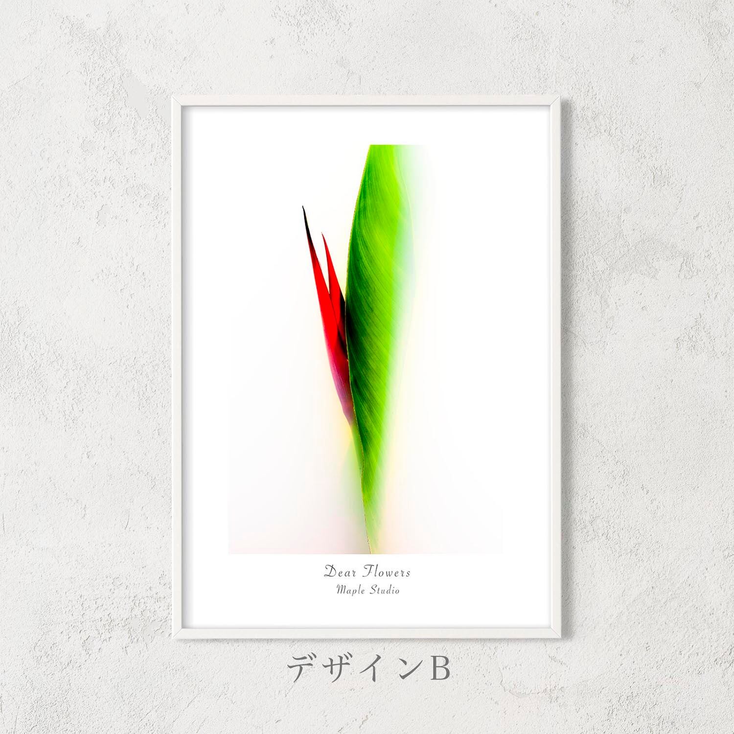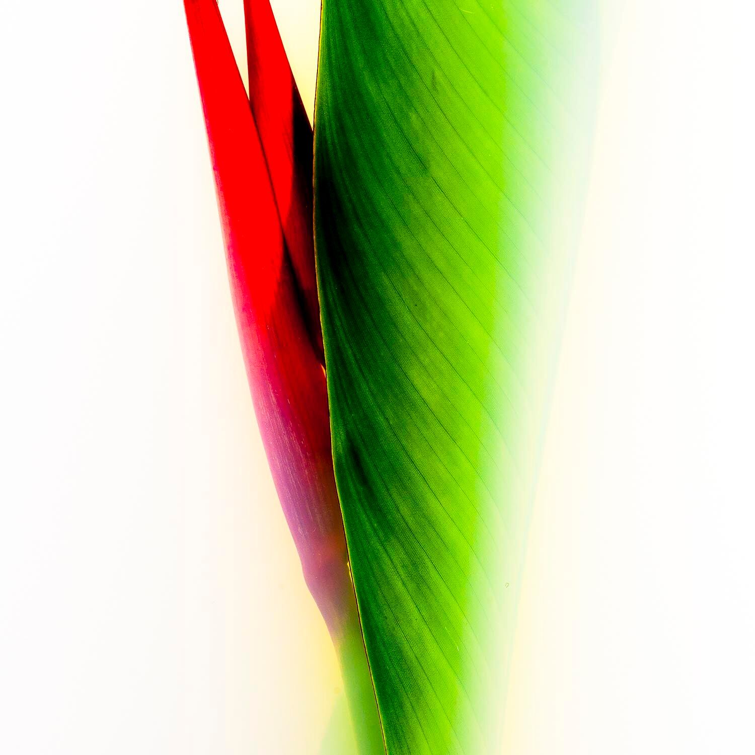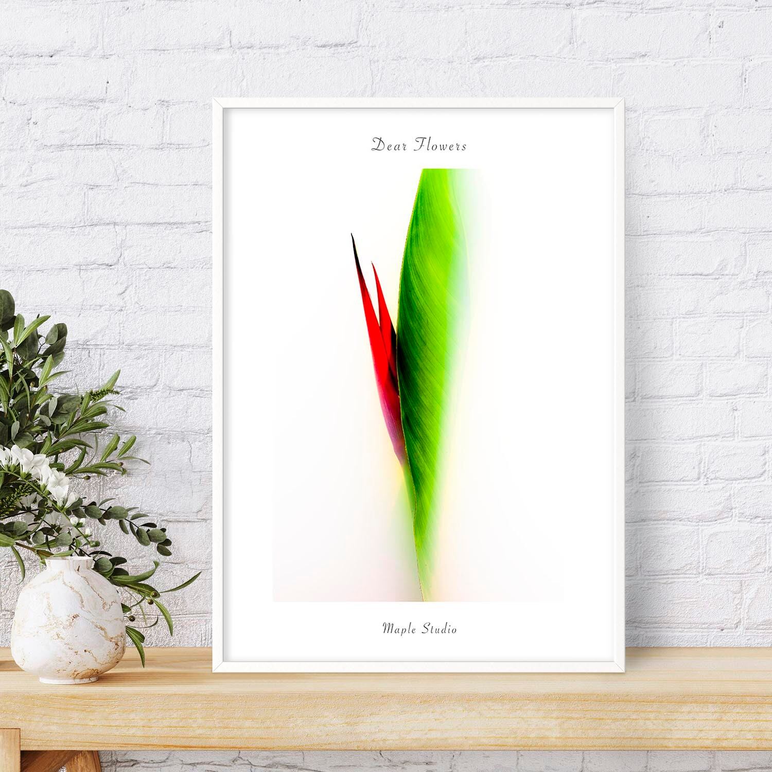 白い背景から、ヘリコニアの赤い苞と緑の葉が鮮やかに浮かび上がり、凛とした美しさが引き立ちます。ヘリコニアのシンプルな形状がよりエレガントに感じられます。